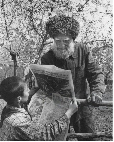 (Yuri Gagarin’in haberi yaşlı köylüye gösteren SSCB’li çocuk.)